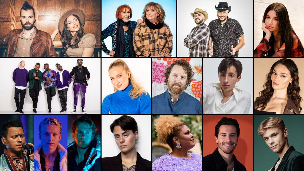 Hälften av artisterna som tävlar i Melodifestivalen 2023. Foto: SVT.