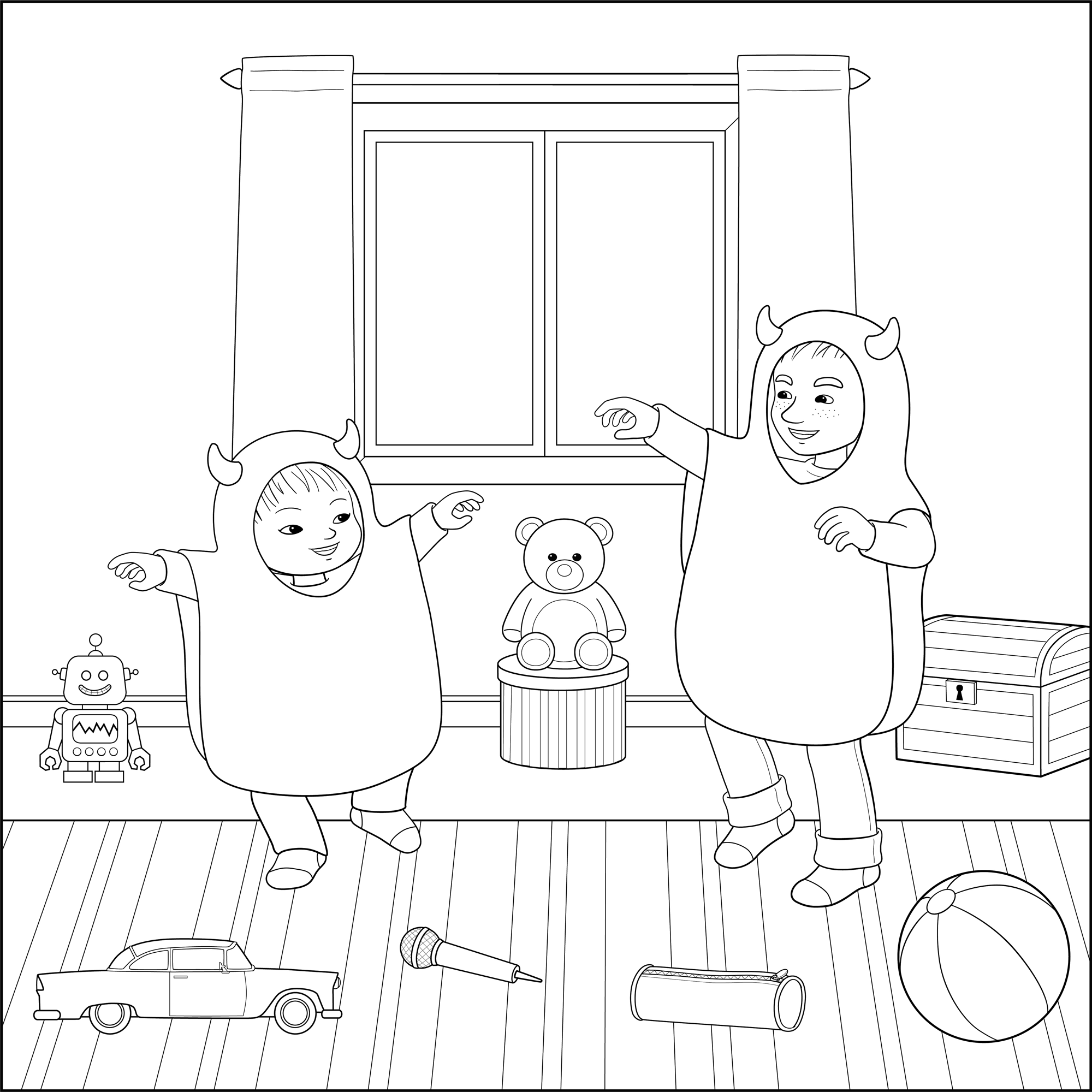 Skriv ut bilden med Minja och Mino och färglägg den.